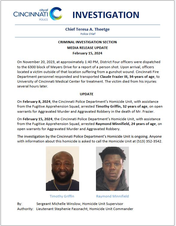 The investigation by the Cincinnati Police Department’s Homicide Unit is ongoing. Anyone
