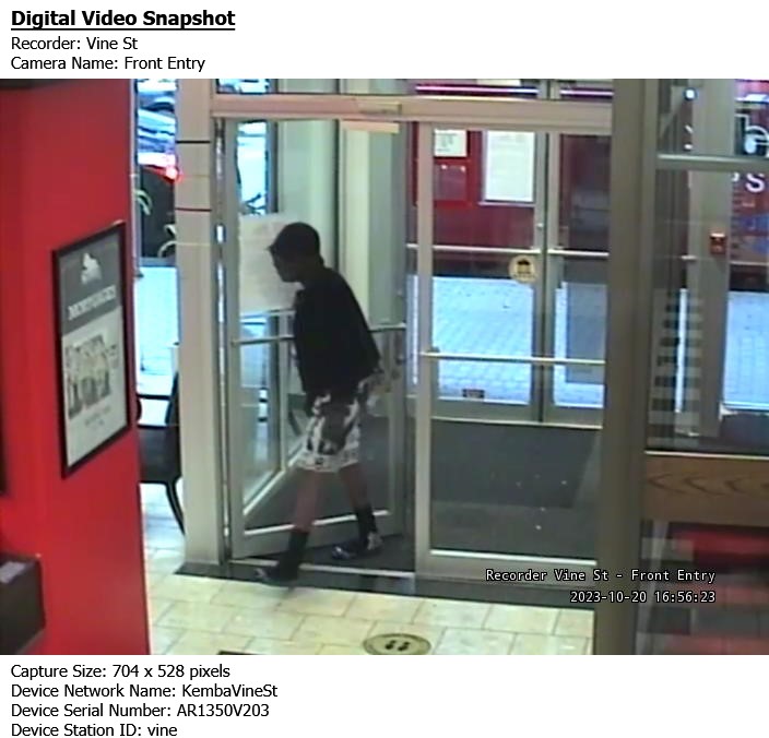 On October 20, 2023, at approximately 16:57 hours, Central Business Section officers responded to Kemba Credit Union at 637 Vine St. for the report of a robbery. A Black male, 40-50 years old, approximately 5’07”-5’10, 160lbs, medium build, wearing sunglasses, a black hat, a black sweater, and a white and black dress, approached the teller and demanded money before climbing over the counter. The suspect fled on foot out the front of the bank and headed north on Vine Street. The suspect fled with an undisclosed amount of US Currency.